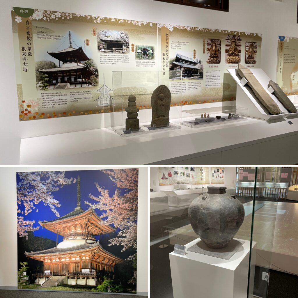 根来寺の最盛期の様子を、発掘調査で出土した埋蔵文化財や古絵図などの貴重な資料で紹介しています。映像による解説もあり、根来寺の歴史と文化をわかりやすく展示しています。