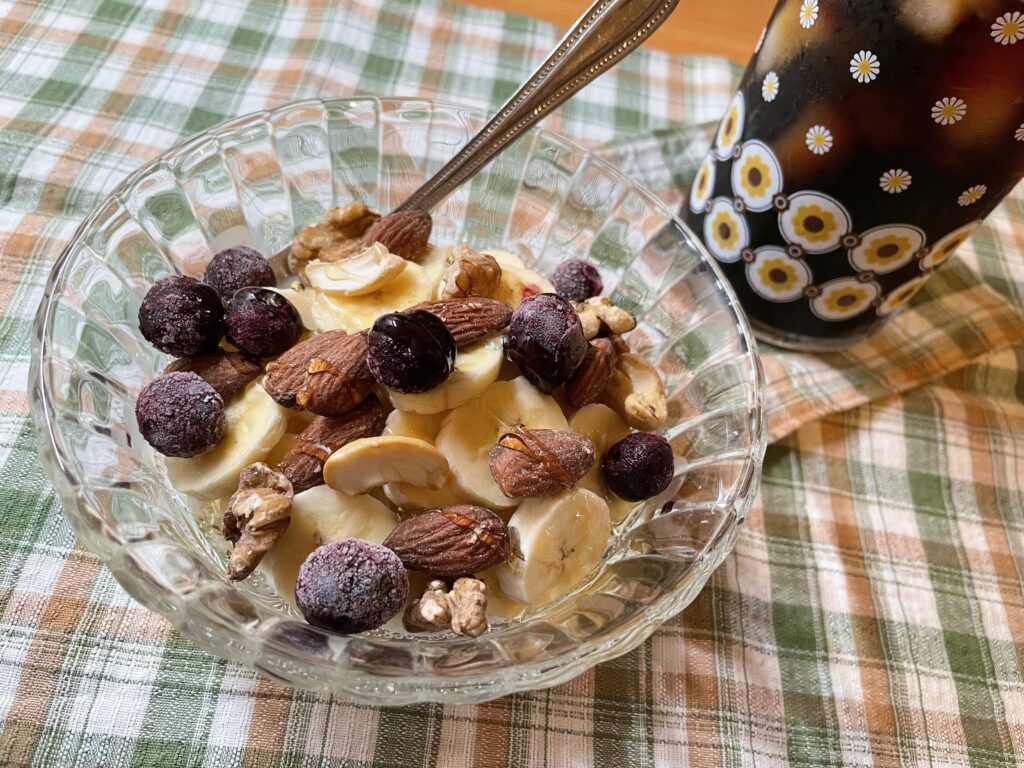 プレーンヨーグルトに、バナナ、ブルーベリー、アーモンド、くるみ、カシューナッツを乗せ、はちみつをかけていただきます。毎日食べても飽きない、私の定番朝ごはん。