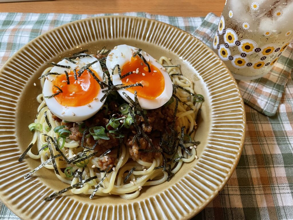 にんにくがガツンと効いたそぼろと半熟卵をトッピング。ひとりご飯は、料理に時間をかけたくないので、1品料理率が高め。