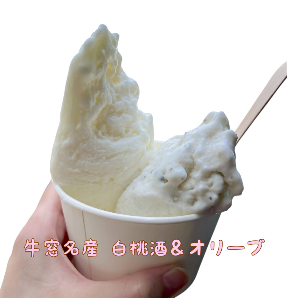 私は「牛窓名産白桃酒×オリーブ」、夫は「しぼりたてミルク×牛窓レモン」を食べました。