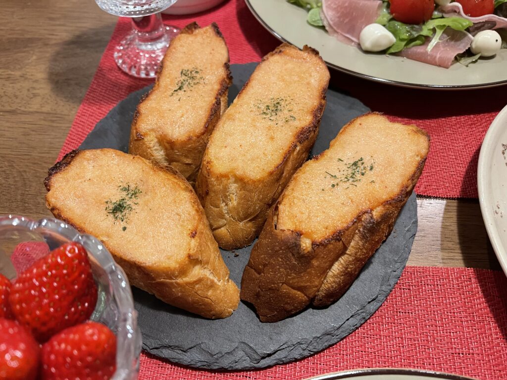 - バゲット4切れに、バターを3gずつのせて1〜2分焼く。(バターが溶けたらOK)