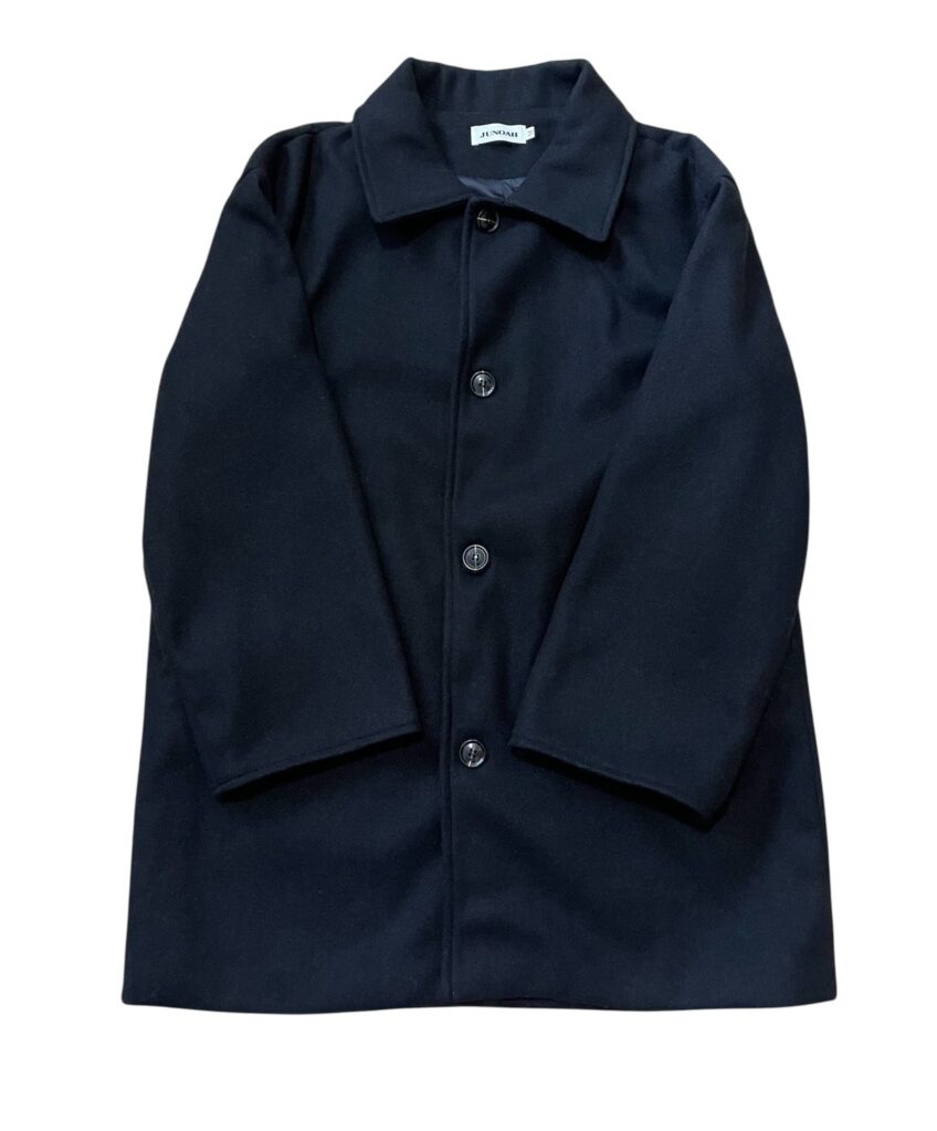 シンプルな形のステンカラーコートは、オン・オフに活用できて便利!