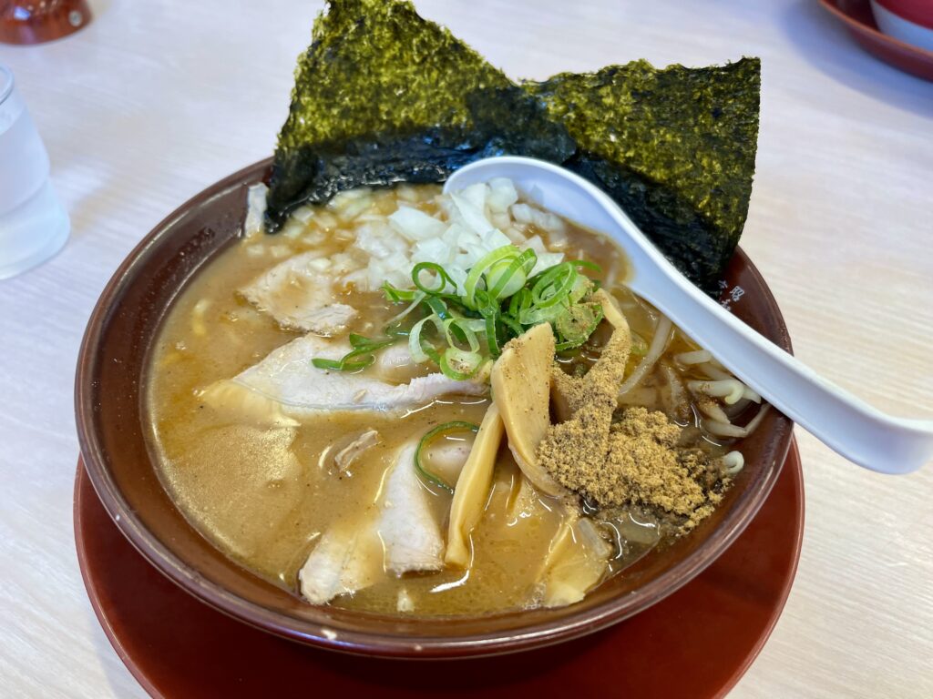 スープによく絡むちぢれ麺、トッピングはチャーシュー、メンマ、もやし、玉ねぎ、ネギ、海苔、魚粉と豪華。