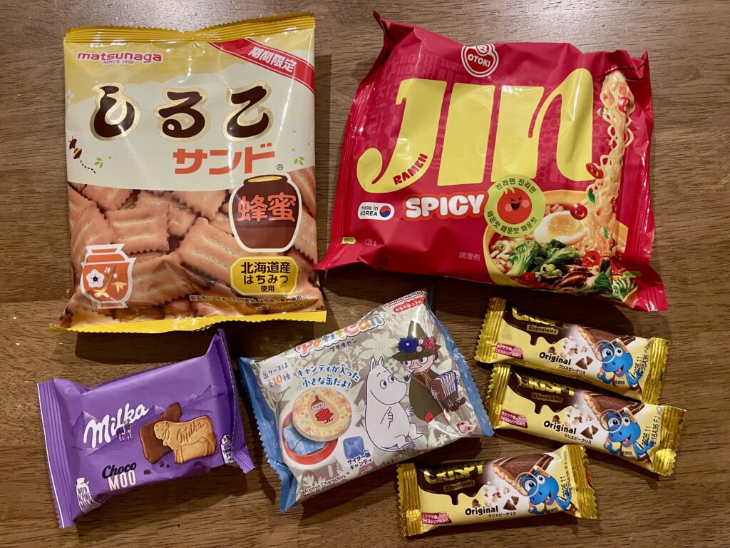大好きなチョコレート、ムーミンの小さな缶にワクワクしたり、たまに食べたくなる辛いラーメンなど…甘いものから、塩っぱいものまで、お菓子ボックスが充実✨