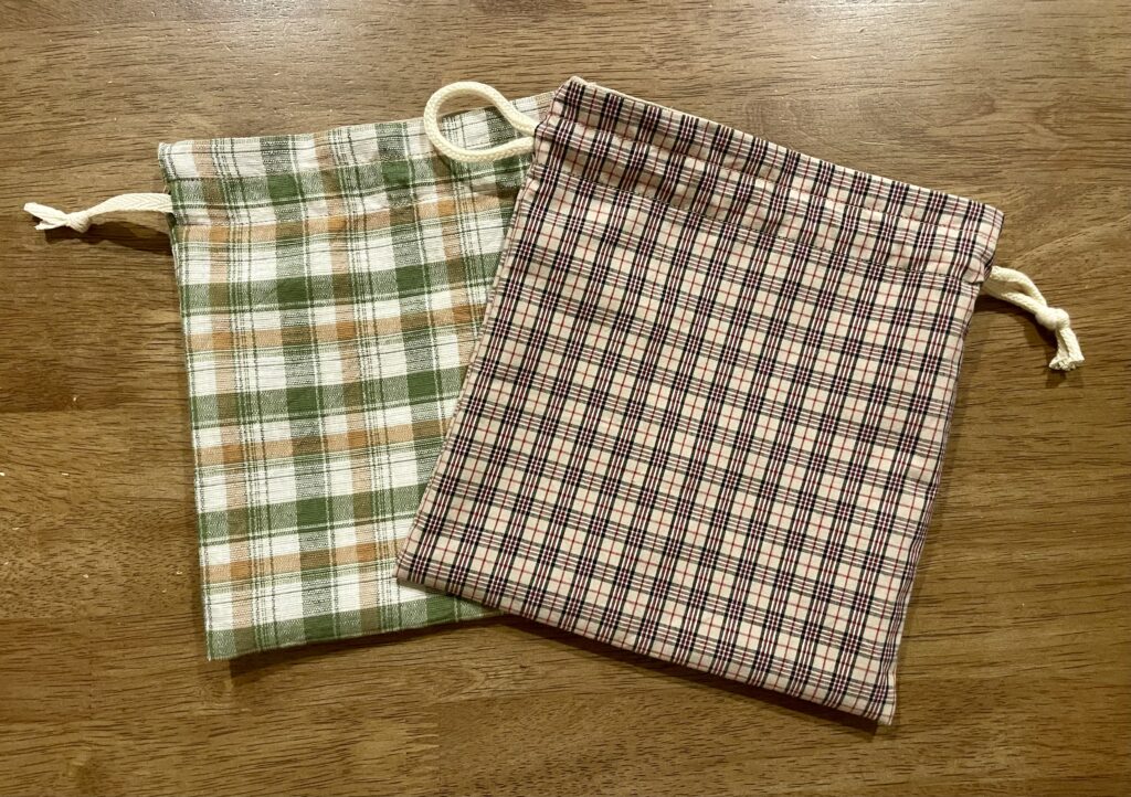 巾着作りは、家にある余った布や100円ショップのカットクロスで十分。