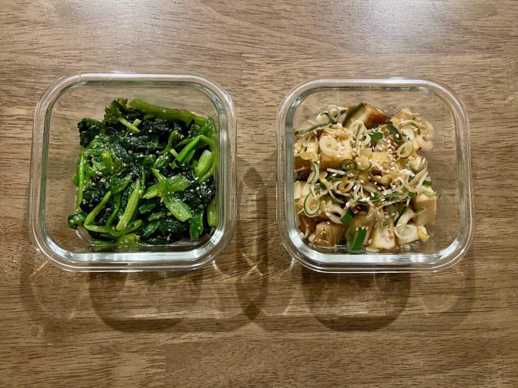 ほうれん草のごま和えや厚揚げの甘辛焼きなど、サッと作れる副菜で十分。